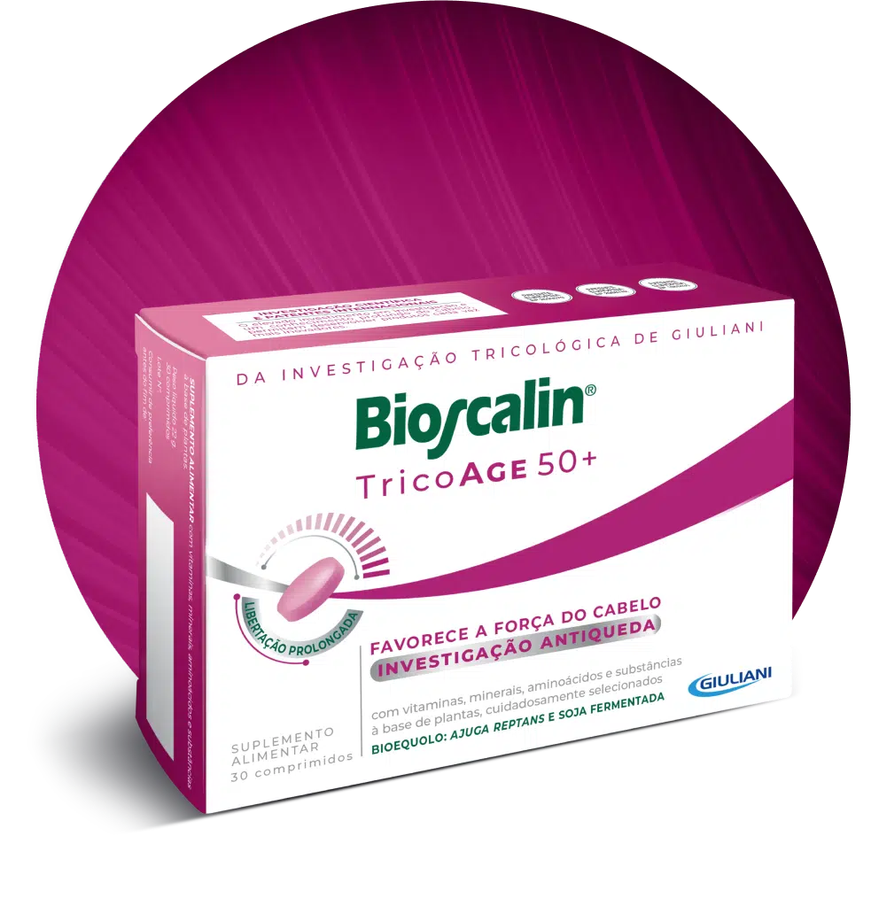 Bioscalin TricoAge 50+ é um suplemento alimentar desenvolvido para mulheres a partir dos 50 anos, quando os cabelos tendem a tornar-se mais finos, frágeis e sujeitos a queda devido a alterações hormonais e envelhecimento natural. A sua fórmula combina o complexo patenteado SincroBiogenina® com Genisteína (um fitoestrogénio da soja), ácido linoleico e ácido lipoico, além de vitaminas e minerais essenciais para a vitalidade capilar.
