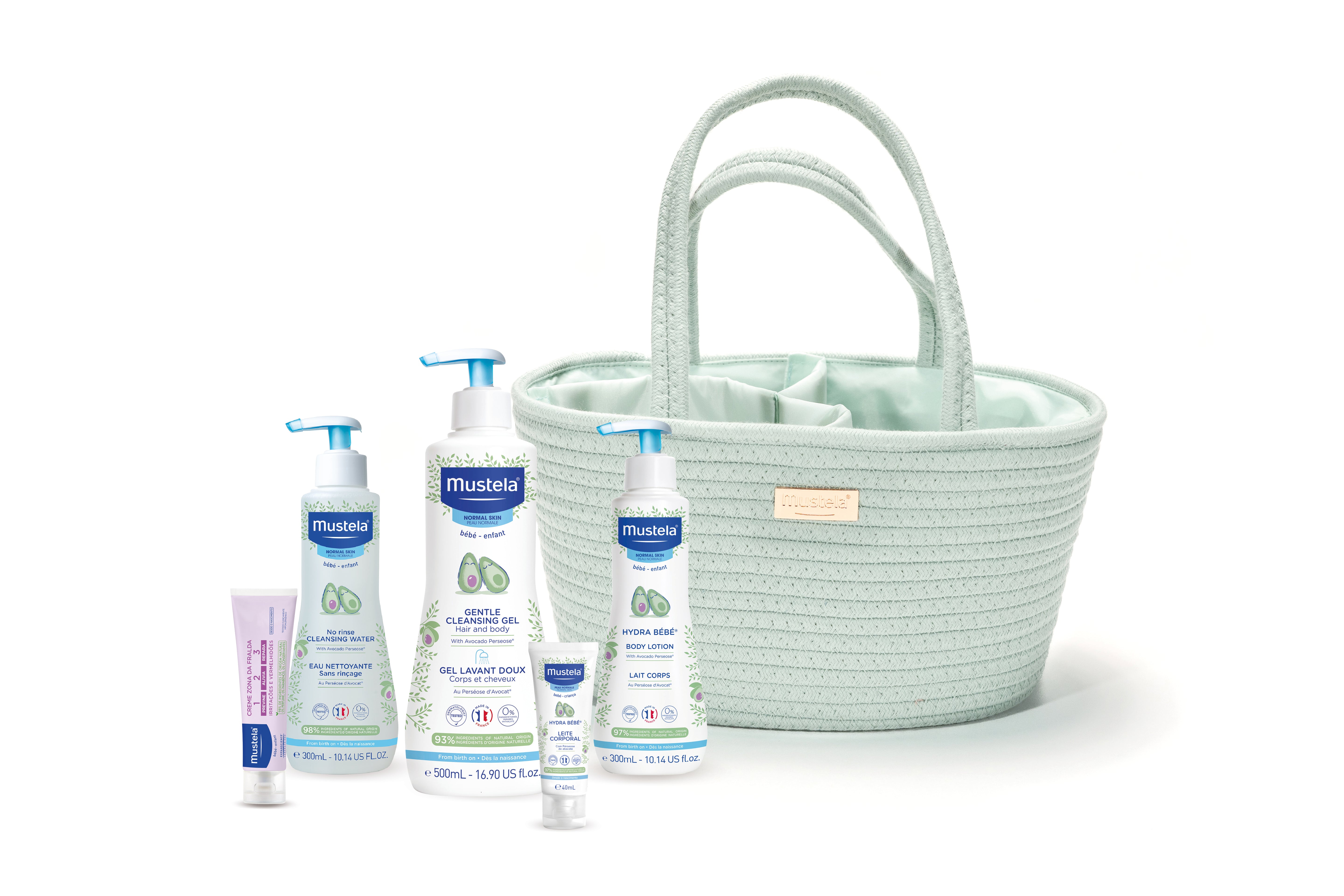 A cesta inclui os produtos essenciais Mustela, formulados com ingredientes de origem natural, pensados para cuidar da pele delicada do bebé: