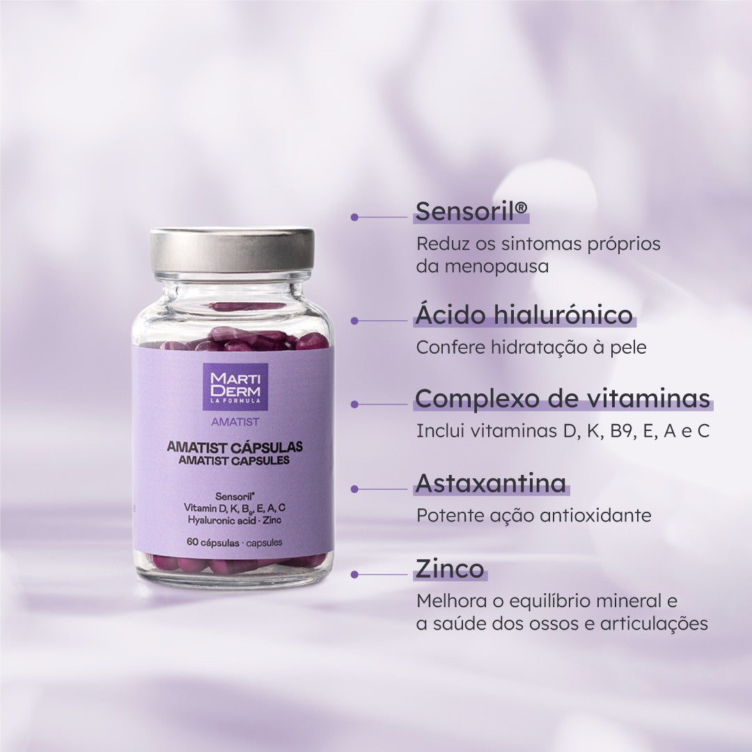 Martiderm Amatist Cápsulas são um suplemento alimentar formulado para fortalecer a pele desde o interior. Com colagénio marinho, ácido hialurónico, coenzima Q10 e antioxidantes, ajudam a melhorar a elasticidade e a hidratação cutânea.