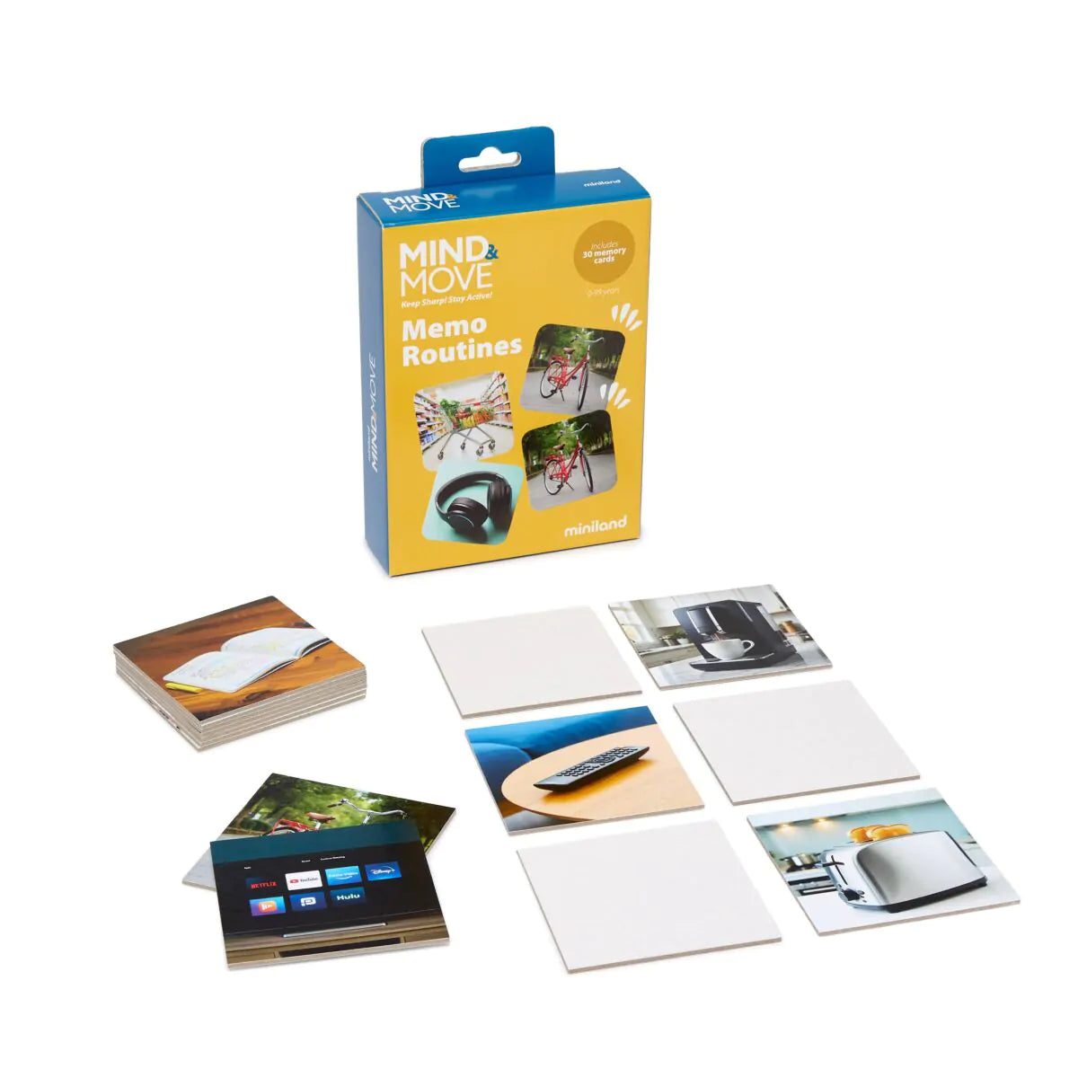 Miniland Mind & Move Memo Routines foi desenvolvido para estimular a memória visual, a atenção e a capacidade de associação lógica, através de um jogo de memória com cartões ilustrados com fotografias reais de objetos e situações do quotidiano, que convida ao reconhecimento, à observação e à conexão com a realidade de cada utilizador.